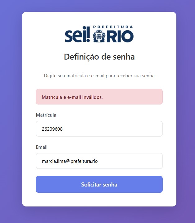 Caso a matrícula ou e-mail não estejam cadastrados, uma mensagem de erro será apresentada. Entre em contato com o Administrador Local de seu órgão .