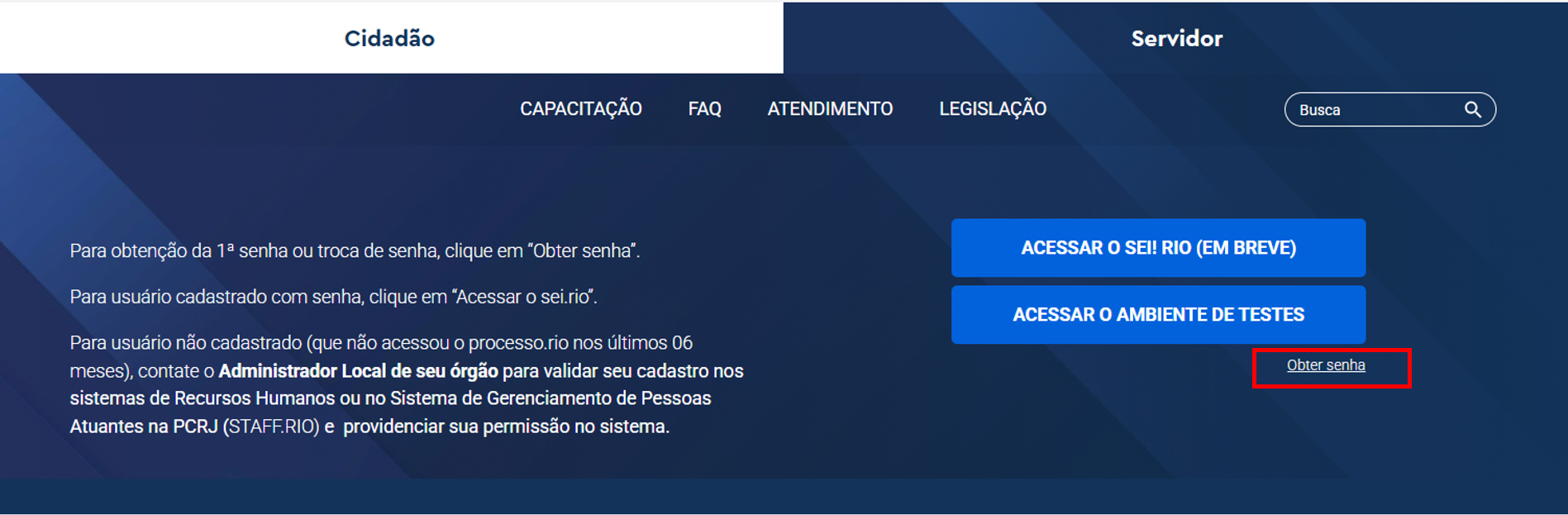 Na implantação do SEI.RIO, todos os usuários que acessaram o processo.rio nos últimos 6 meses já estarão cadastrados automaticamente no sistema, sendo necessário apenas gerar a 1ª senha.