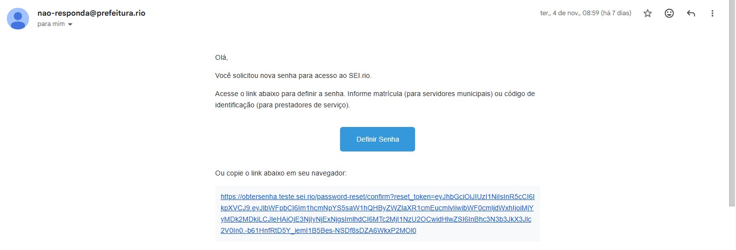 O e-mail conterá o link para a definição da senha, será válido por 1 hora.
